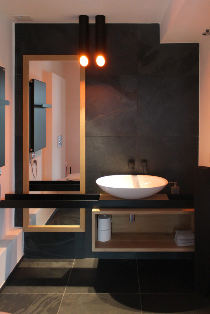 Nella taverna sul lago, alle porte di Bucarest, il volume seminterrato si incastra nella collina e si apre con una lunga vetrata verso il pontile: fuori una grande terrazza in legno e la facciata a doghe orizzontali, dentro pareti bianche a finitura materica e un pavimento in legno scuro che scalda lo spazio. La cucina lineare in essenza naturale con top e pensili neri dialoga con il tavolo conviviale e le sedie intagliate, mentre la panca rivestita in tessuti a righe richiama la tradizione contadina. Il cuore è il camino/stufa in muratura bianca, attorno al quale si raccolgono tappeti kilim, utensili in rame, cucchiai scolpiti e ceramiche: piccoli reperti domestici che raccontano il territorio. Tutto è improntato a materiali naturali, gesti semplici e memoria: una stanza della terra affacciata sull’acqua, dove tradizione e contemporaneità si intrecciano con naturalezza.